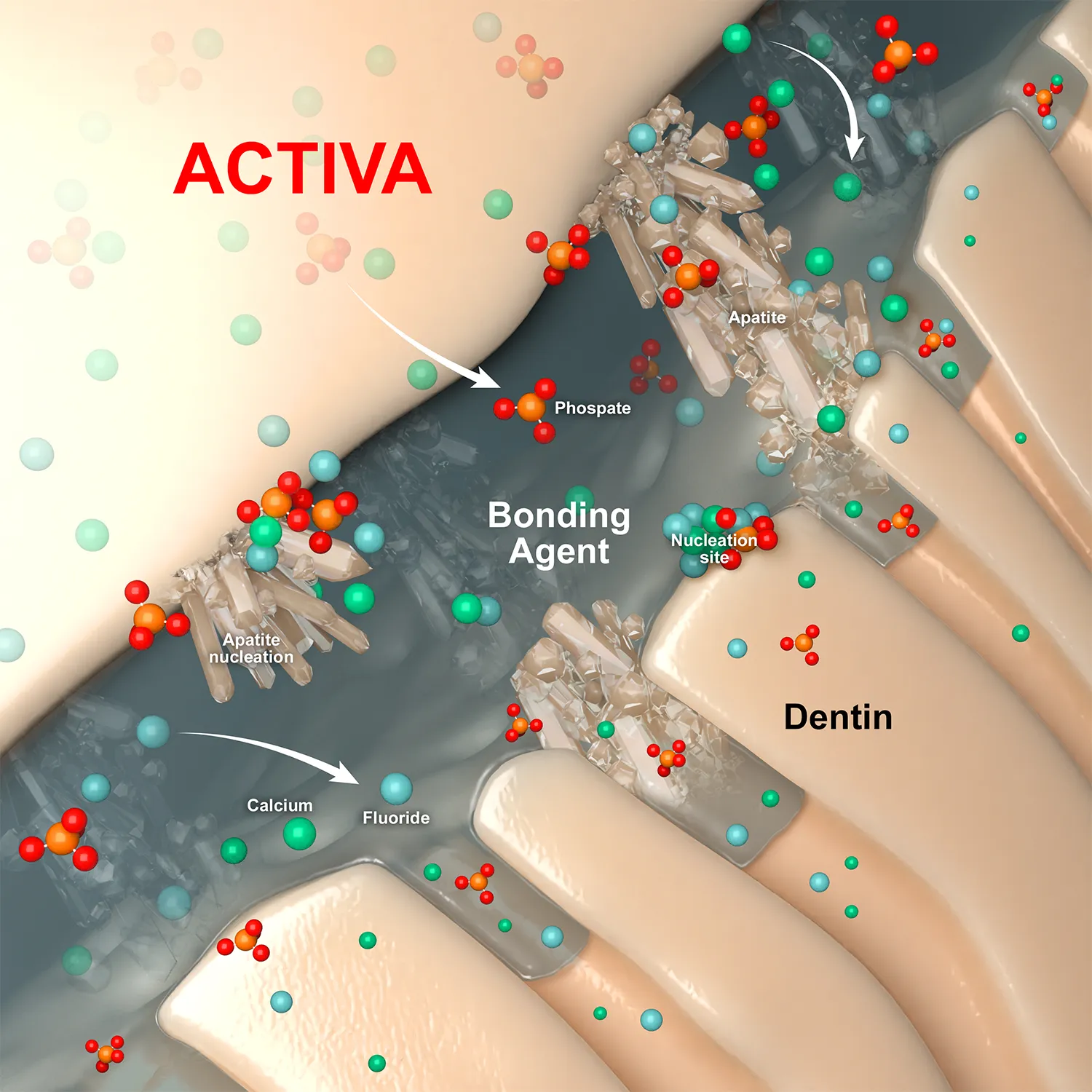 * ACTIVA-BioACTIVE releases beneficial ions of Fluoride, Calcium and Phosphate while physically sealing the material and tooth interface margin through apatite crystal formation, subsequently protecting against microleakage, the leading cause of secondary caries and recurrent decay.